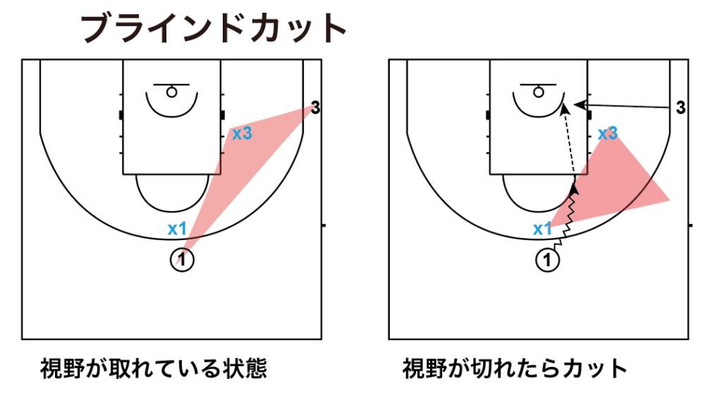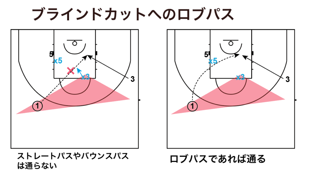 ブラインドカットに対して、使うノールックパスは2種類あります。