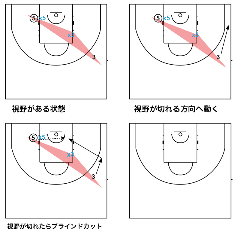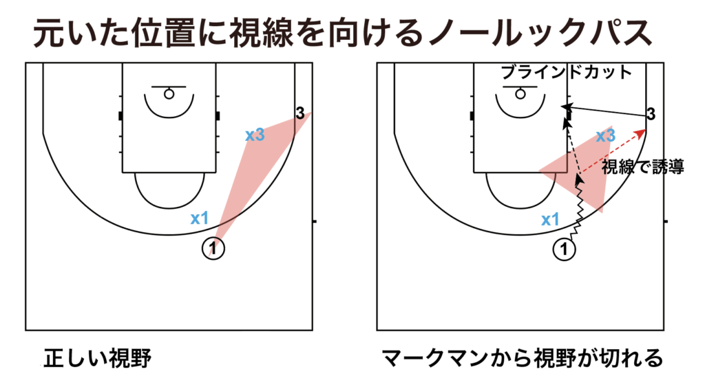 ポストへのパス、ウイングへのパス、カッティングへのパス、様々な場面で自分のマークマンと視線を合わせながらのノールックパスが有効に働きます。