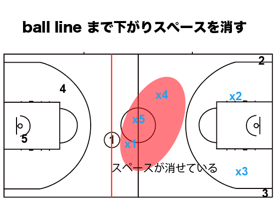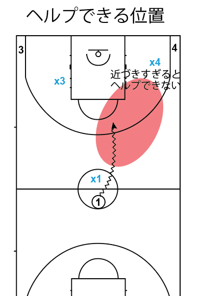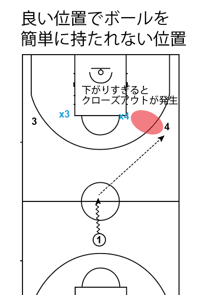不必要にペイントを守りに行ってマークマンを離しすぎてしまうと、ショートクローズアウトが発生して、(場面的)優位性を作られてしまいます。
