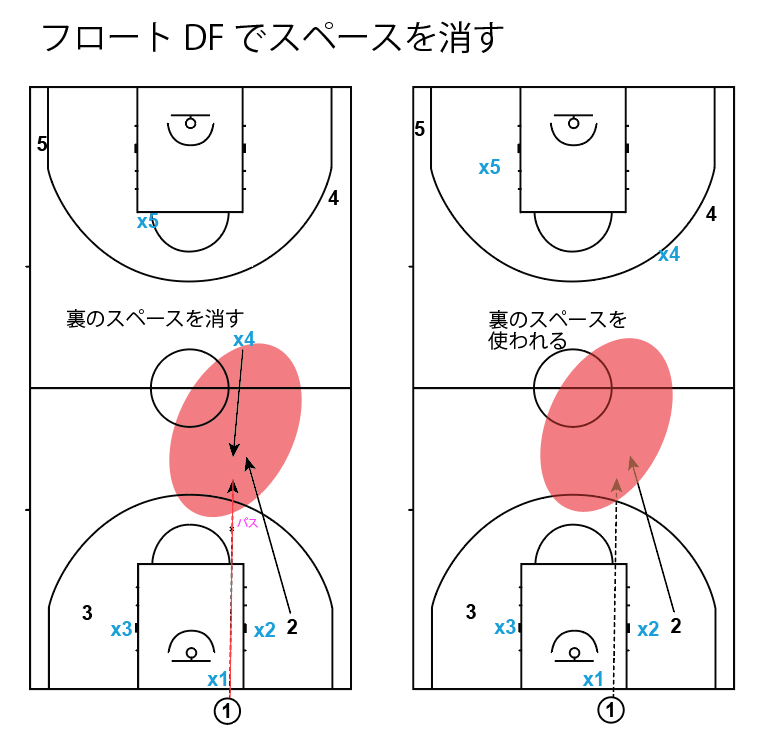 トランジションDFでは守るスペースが広いので、ハーフコートよりも自分のマークマンを離して(フロートして)スペースを消すポジショニングが重要です。