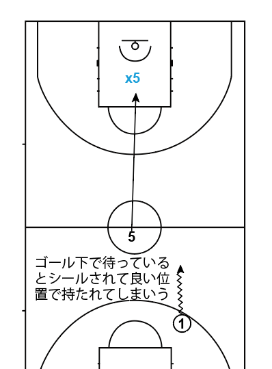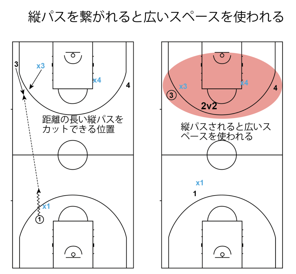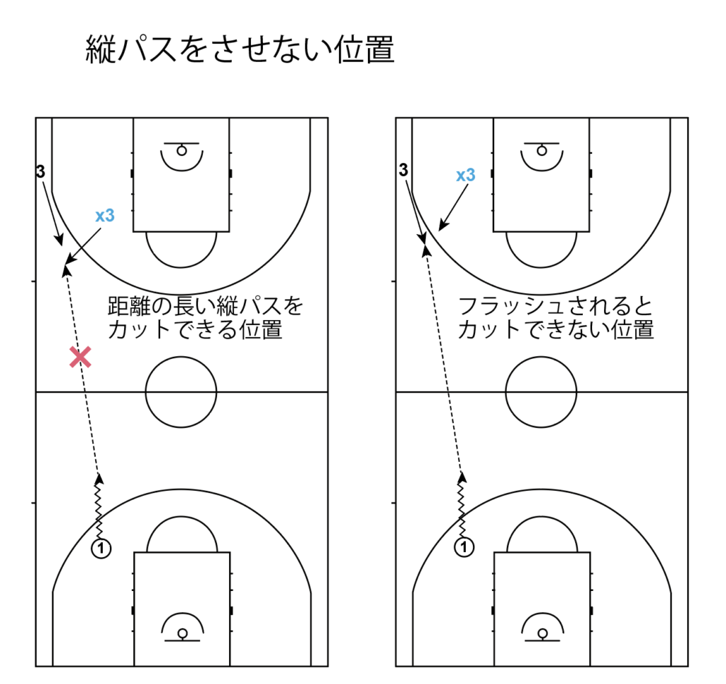特に育成年代はしっかり指導しないと、ハーフコートのときと同じようなポジショニングをしてしまうことが多いので、注意が必要です
