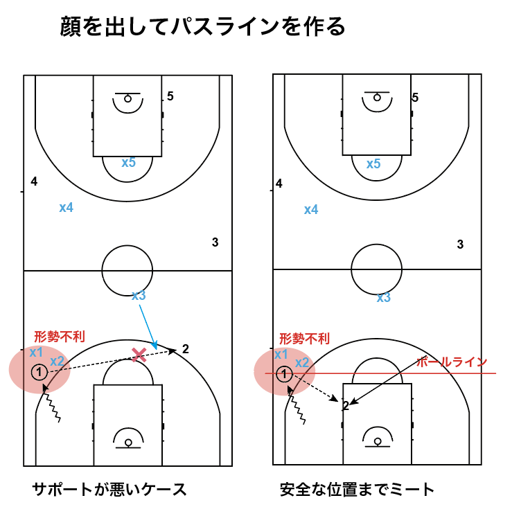 まず、先述のように最初のサポートがオールコートではボールラインよりも低い位置、ハーフコートでは、ハーフライン付近の高い位置(ファースロットととも呼びます)にサポートに行きます。