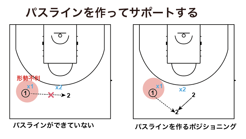 オフボールのプレーヤーがどれだけサポートの意識があるかで、チームオフェンスの良し悪しが決まります。