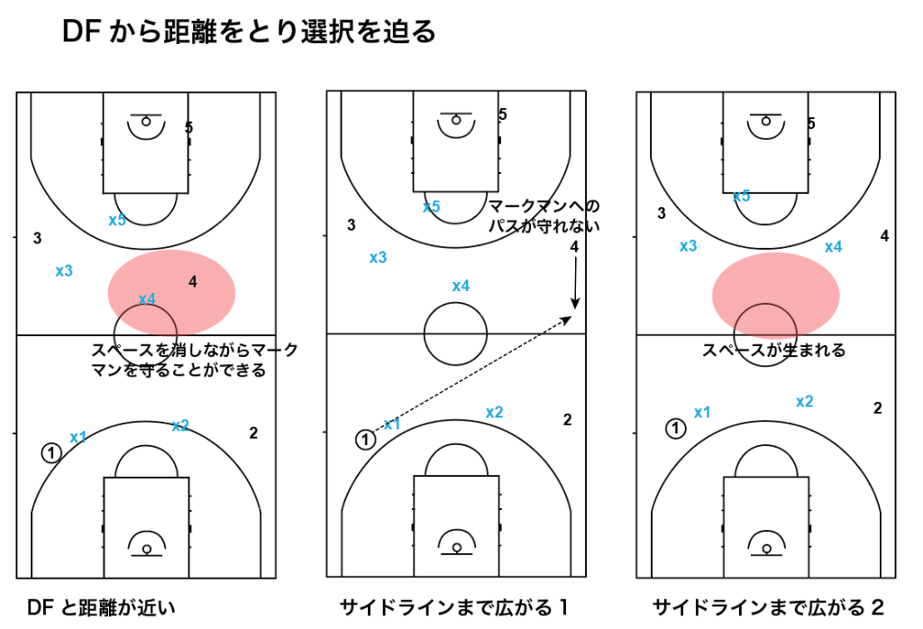 そうさせないために、DFからなるべく距離をとって広がり、DFに対して