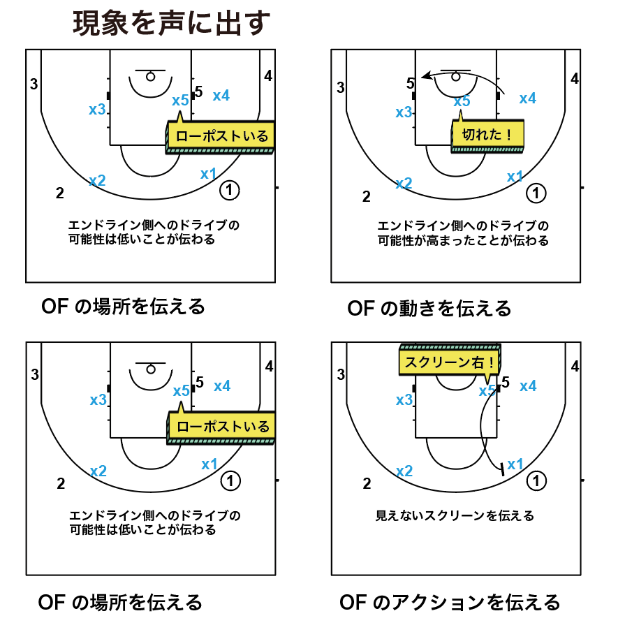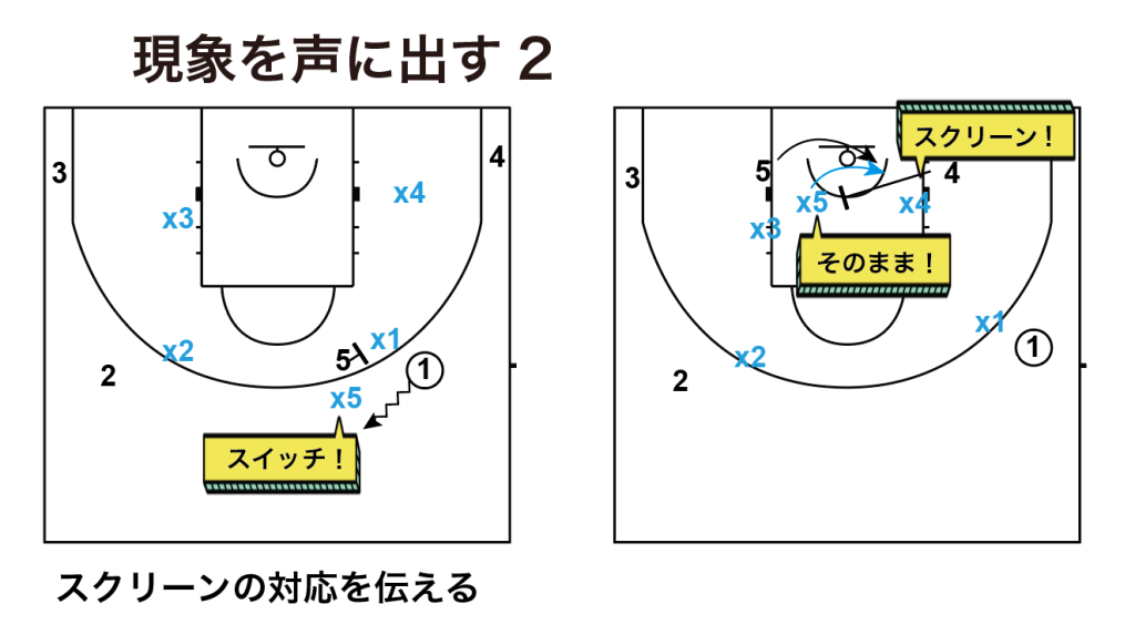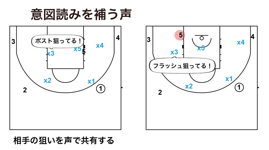 声を出せないことで、OF時に起こったスイッチによるクロスマッチを、1人が解消しようとしていて、1人はそのままピックアップしていることにより、同じマークマンに2人つくようなことが起こってしまいます。