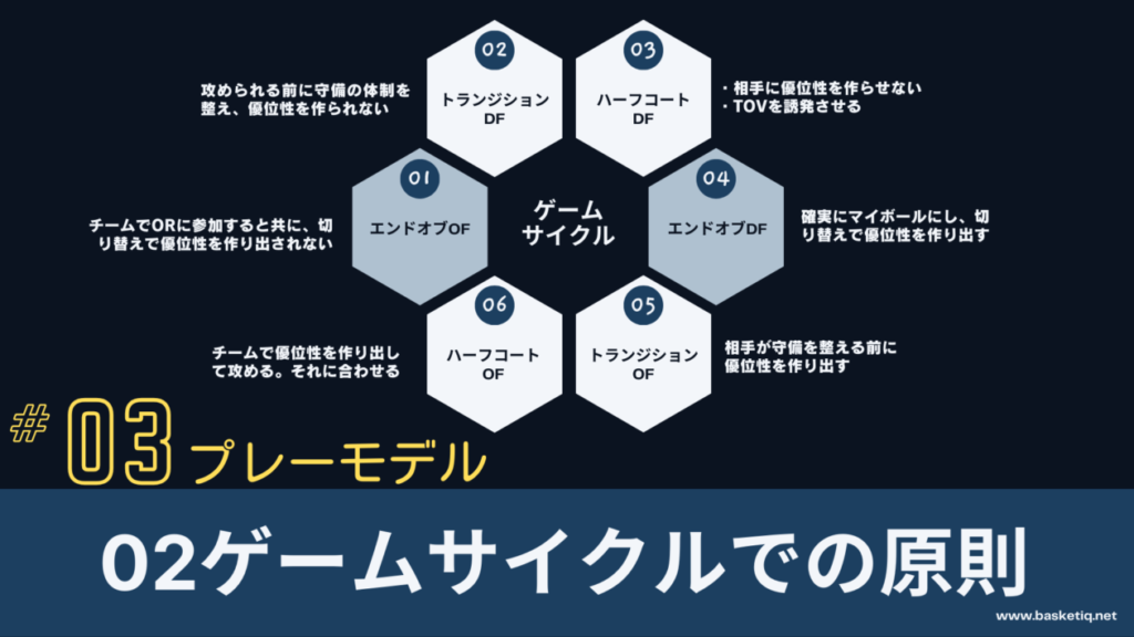 【ゲームサイクルでの原則】とは、バスケットボールのゲームの一連の流れを6つに分類して整理し、それぞれの局面で重要な原則を体系化したものです。